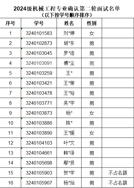 根据《浙江大学本科生主修专业确认办法》(浙大发本〔2016〕109号)文件,本科生院《关于2024级本科生主修专业确认工作的通知》,以及《2024级机械工程学院主修专业确认工作细则》,经学生申请,机械工程学院主修专业确认工作小组根据全部申报学生信息材料进行认真审核,确定面试名单见下。面试安排为: