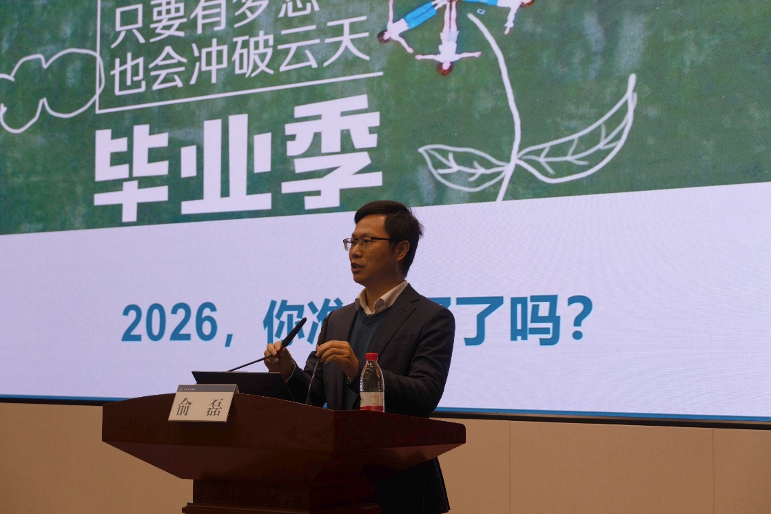 俞磊对当前就业形势进行分析与解读,他指出,同学们要定位自己的人生理想,做出能力水平、培养目标、兴趣价值观综合的最佳选择,努力将专业知识与家国情怀相结合,谱写新征程下的奋斗新章。