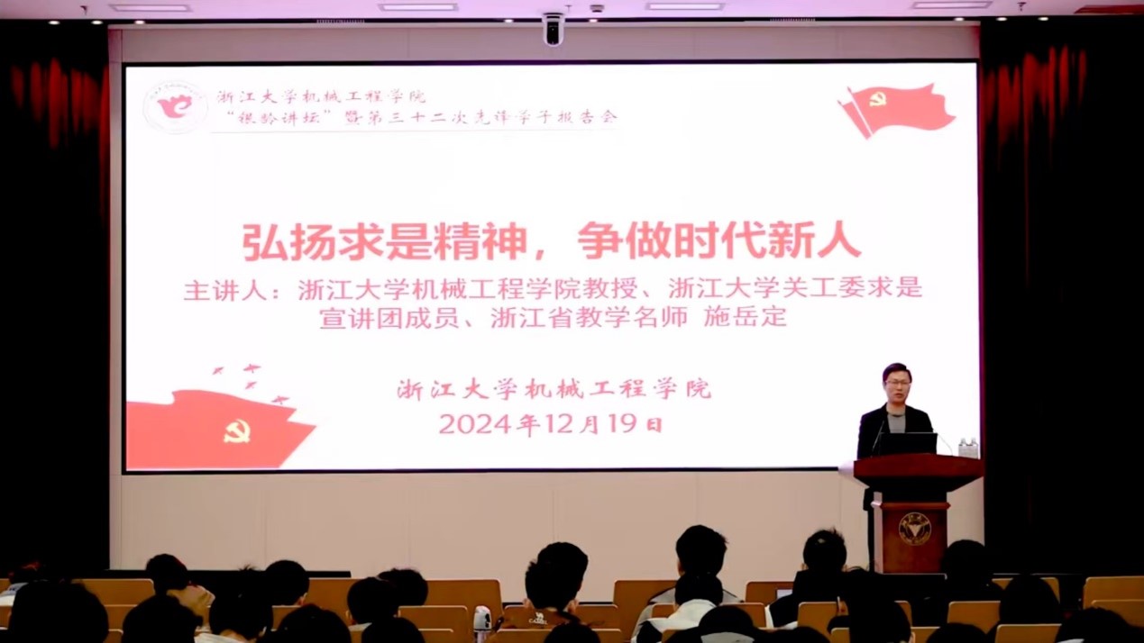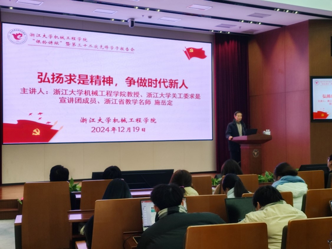 为充分发挥“五老”优势传播正能量,引导学生党员精益求精、敢为人先、为推动科技创新贡献青春智慧和力量,2024年12月19日下午,机械工程学院于紫金港校区开物苑2-328报告厅举办“银龄讲坛”施岳定教授报告会暨“先锋学子”全员培训第三十二次培训,机械工程学院全体学生党员通过线上线下相结合的形式参加了此次培训。