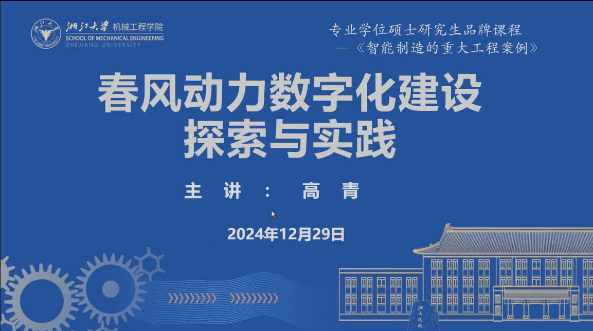 12月29日,浙江春风动力股份有限公司董事、副总裁高青应邀为我院2024级专业学位硕士研究生带来题为《春风动力数字化建设探索与实践》的精彩报告。