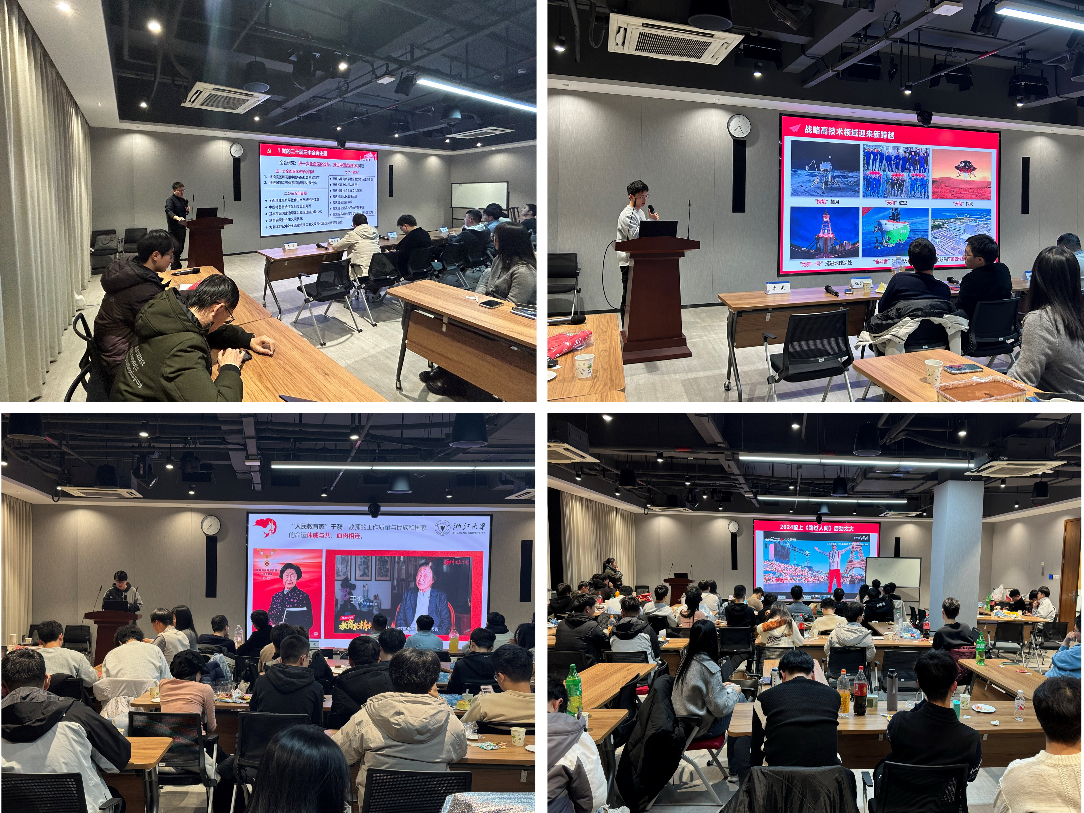 王孟可同志主讲了“深入学习全国科技三会精神”的理论学习,重点介绍了习近平总书记在全国“科技三会”的重要讲话精神,展示了基础前沿研究实现的新突破、战略高技术领域迎来的新跨越、以及创新驱动引领高质量发展取得的新成效,号召同学以国家战略科技需求为导向,树立身为青年研究生的职责使命,肩负起解决“卡脖子”问题的重任。