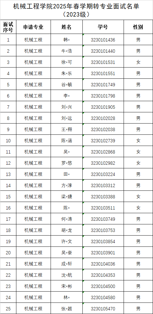 经学生申请,机械工程学院主修专业确认工作小组对申报的2023级本科生学生信息进行认真审核,现确定面试名单见附件。面试安排如下: