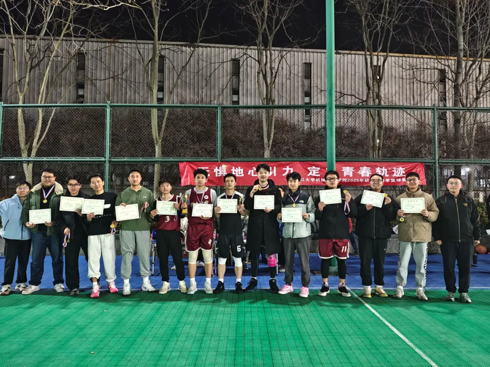 本次篮球赛得到了大家的踊跃参与,共吸引了5支队伍共57名队员报名参加,经历8场比赛的紧张角逐。2025年3月19日19:30,777队和机械梦之队展开了激烈的冠军争夺战。尽管天气恶劣,但两队队员们都全力以赴,进行了一场酣畅淋漓的对决。最终777队以60:56击败机械梦之队获得本次机械工程学院研究生春季篮球赛的冠军。至此,本次机械工程学院研究生春季篮球赛落下帷幕。赛后,赛事主办方为冠亚军颁发了证书和奖杯并合影留念。