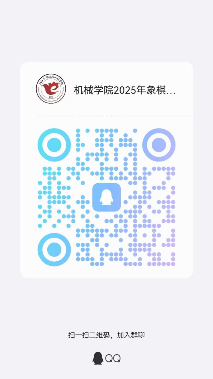 1.有意报名参赛的机械工程学院学生请于5月9日前加入QQ群聊“机械学院2025年象棋团体公开赛通知群”(群号:1044692990)(见下图),并填写报名表。学院报名负责人将于群内收集成员信息并协助各参赛队员完成后续报名操作。