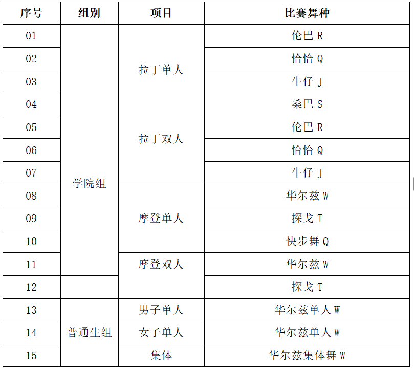 1.学院组参加拉丁单人自选(01-04)、拉丁双人自选(05-07)、摩登单人自选(08-10)项目和摩登双人自选(11-12)项目,其中拉丁单人、摩登单人性别不限;拉丁、摩登双人必须一男一女搭档完成伦巴、恰恰、牛仔、华尔兹、探戈舞自编动作,可以跨学院组队,取得名次分数对半。比赛顺序由大会抽签决定,音乐由大会统一播放,于赛前一周内公布。