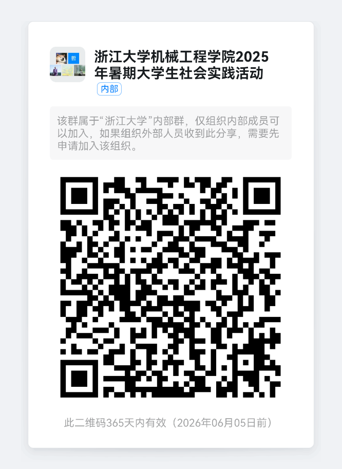 请社会实践团队学生负责人扫码加入浙江大学机械工程学院2025年暑期大学生社会实践活动钉钉群,实践过程中有疑问可在群里进行咨询。