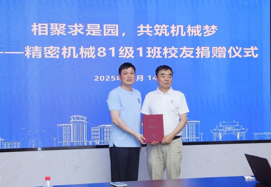 随后,大家来到开物苑1幢208会议室。精心准备的返校礼物早已整齐地放在桌上,等待校友打开。校友们迫不及待地试穿红色院衫,别上校徽,现场洋溢着一片温馨与喜悦。紧接着,在热烈的鼓掌声中,王柏村副院长首先向校友们汇报了学院近年的发展情况与成果。介绍完毕后,学院举行了捐赠仪式,以感谢精密机械81级1班校友们向学院院友林项目的慷慨捐赠。张凯老师代表学院致辞,感谢校友们对学院发展的大力支持。王柏村副院长代表学院为校友们颁发捐赠荣誉证书,吴添羽校友作为代表上台领取。时逢毕业四十周年,学校也为于秩年返校的校友们定制了返校纪念证书。