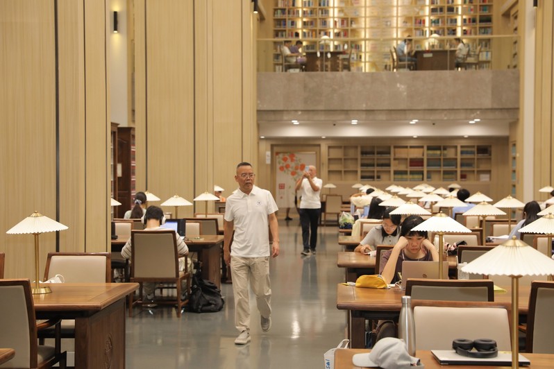 离开玉泉校区,校友们集体乘车前往紫金港校区,首先参观了南大门、求是大讲堂与主图书馆。求是文化宣讲队的尤同学为校友们介绍了几座标志性建筑,讲解生动有趣。机械工程学院发展联络办公室的张凯老师引导校友们参观主图书馆,介绍了馆内的展览与布置。穿梭于书架间,大家对校园日新月异的变化惊叹连连。
