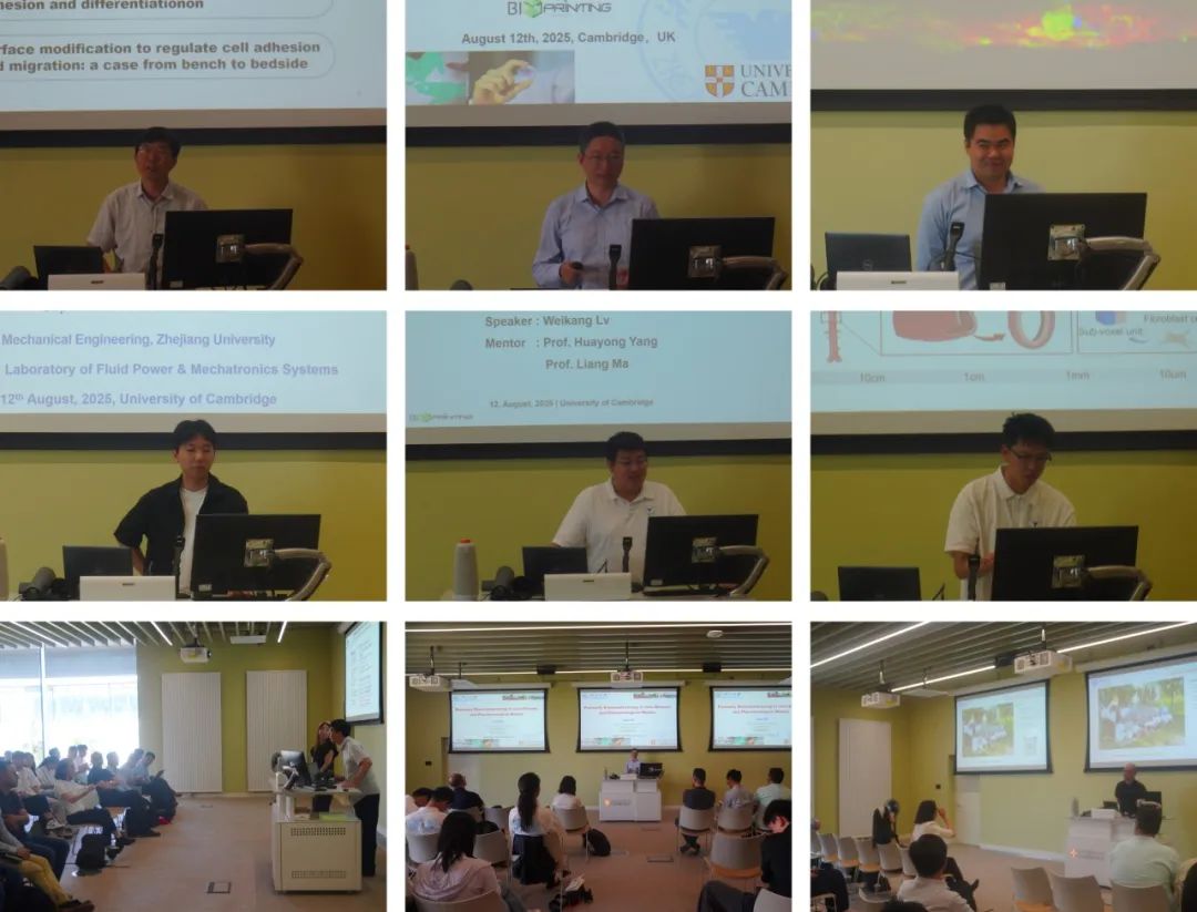 8月11-12日,交流团前往剑桥大学,在West Hub参加了由浙江大学、清华大学、复旦大学与剑桥大学四校师生共同举办Cambridge Biofabrication Workshop。会上,复旦大学的丁建东教授、清华大学的方永聪教授与熊卓教授、剑桥大学的Chengxi (Todd) Zhu博士和Yuanxin Zhang博士,以及浙江大学的马梁教授及博士生吕为康、余舒源、李轶博,分别分享了各自团队在生物制造领域的最新研究成果,展示了跨校交流与合作的学术活力。