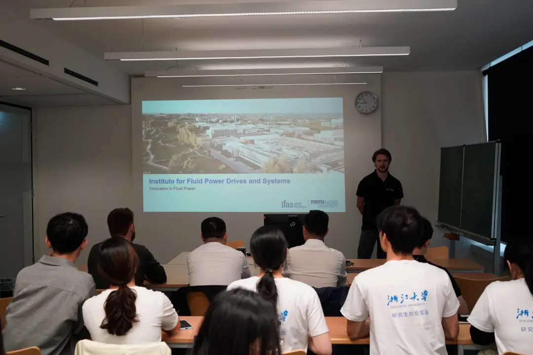 访学期间,交流团前往亚琛工业大学。在校友吕飞的带领下,参观了亚琛工大的校园,了解了学校的历史文化、区域分布、特色建筑以及文化遗迹。在亚琛工业大学流体传动与系统研究所(IFAS),IFAS所长Katharina Schimitz教授、访问学者吕飞与交流团展开座谈。研究所工作人员首先介绍了IFAS的历史沿革,并从移动机器、工业数字化、高性能元件等多个方面讲解了研究所聚焦的研究方向。随后双方围绕液压技术发展、移动设备数字化及中德合作机制等议题展开深入探讨。座谈结束后,IFAS工作人员带领交流团参观了研究所实验室,通过实地考察深入了解包括液压元件温升与噪声控制等多个实验装置及其应用场景。工作人员还介绍了IFAS在工业机械节能控制、智慧驾驶系统等前沿方向的研发成果,展示了IFAS在液压与智能控制领域的技术实力。