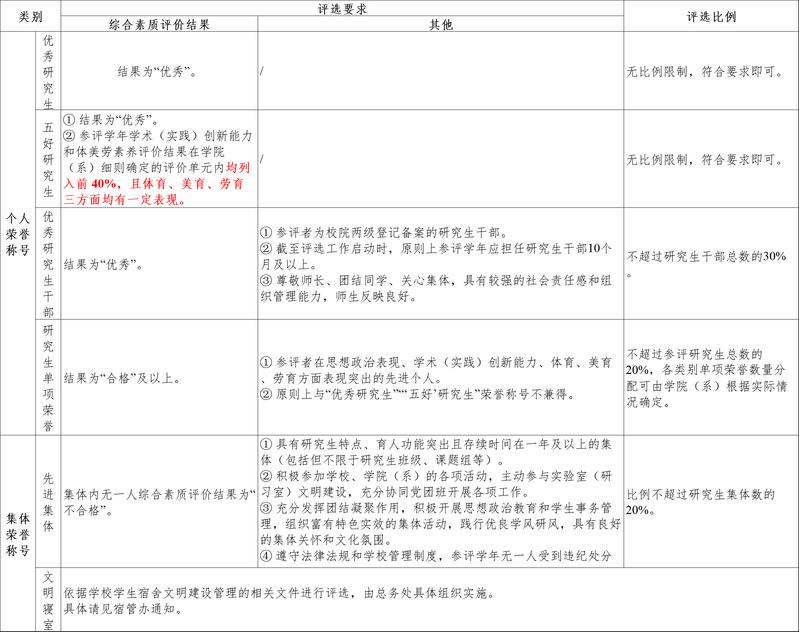 研究生先进集体的评比比例不超过研究生集体数的20%,且集体内无一人综合素质评价结果为“不合格”。