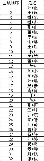 3.面试形式:单面,个人自我介绍+专家提问回答,每人1-2分钟的自我介绍,之后进入评委提问环节。每人总时长5-6分钟。按面试名单(见下)依序进行。