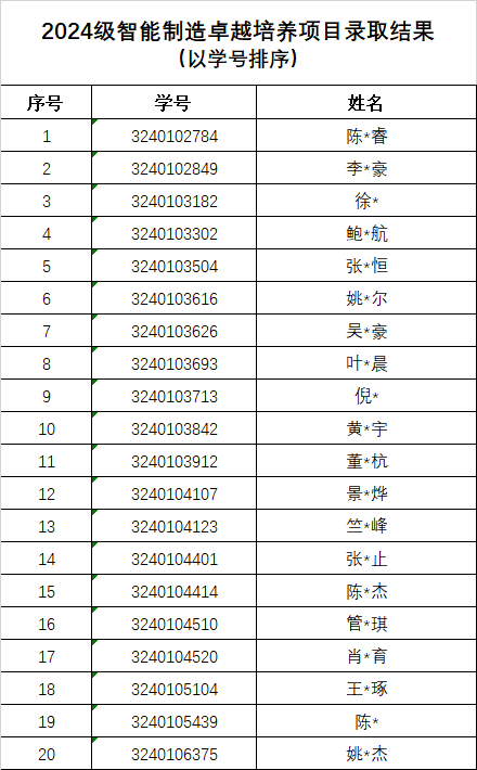 根据机械工程学院智能制造卓越培养项目的选拔要求,经学生本人申请,机械工程学院对学生信息材料进行认真审核,面试遴选等综合评价,现将2024级智能制造卓越培养项目录取结果予以公示,公示期即日起至2025年10月18日17:00。