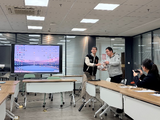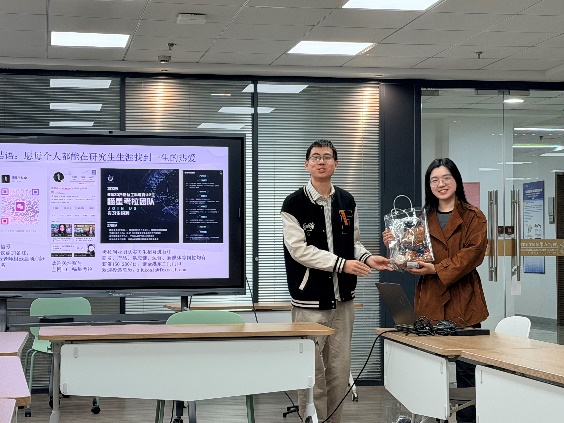 在经验分享环节之后,班级团支部特别为两位嘉宾准备了浙大特色的定制纪念品,由班长代表全班同学现场赠送,寄托着对学长学姐悉心分享的诚挚谢意。
