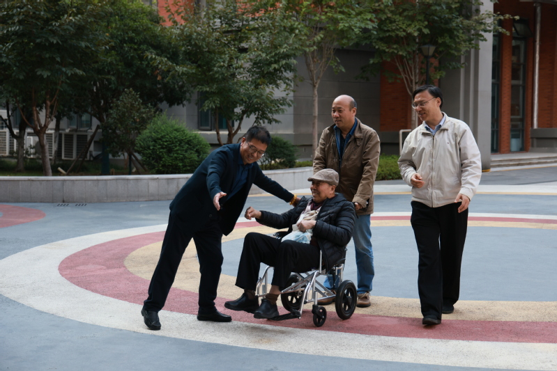 学院一楼显示屏上展示着欢迎翁校友访问母校的视频,当画面掠过紫金港校区的风景时,翁老站起身,看得很仔细,不愿错过任何一帧画面。在“浙大机械”四字下合影时,翁老坚持从轮椅上站起来,站得笔直有力。