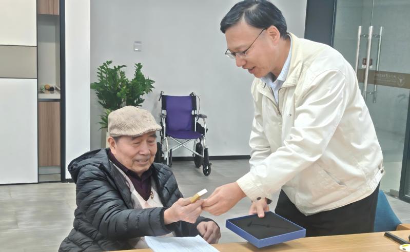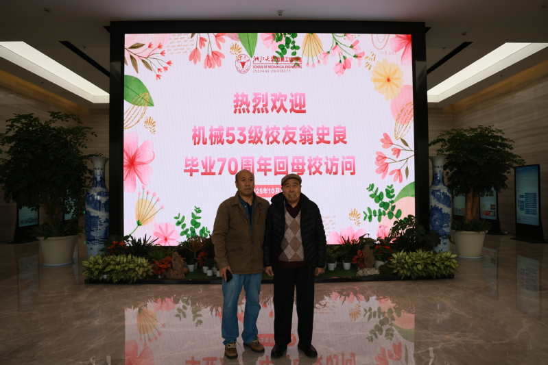 2025年10月22日下午,九十岁的翁史良校友在儿子翁炜先生的陪伴下,回到阔别七十年的母校浙江大学,在机械工程学院的开物苑大楼,学院发展联络办公室潘善洪、张凯、李雨欣等学院机关师生代表已在门口等候。见到翁老,大家纷纷上前迎接,欢迎学长回家。