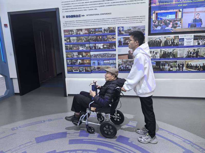 随后,翁老参观了流体动力基础件与机电系统全国重点实验室。看到先进的科研设备,他兴致勃勃地询问技术细节,尤其关注学院科研进展。尽管已是九十高龄,翁老的思维依然敏捷,精神矍铄。