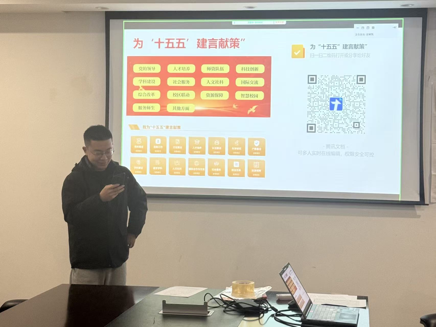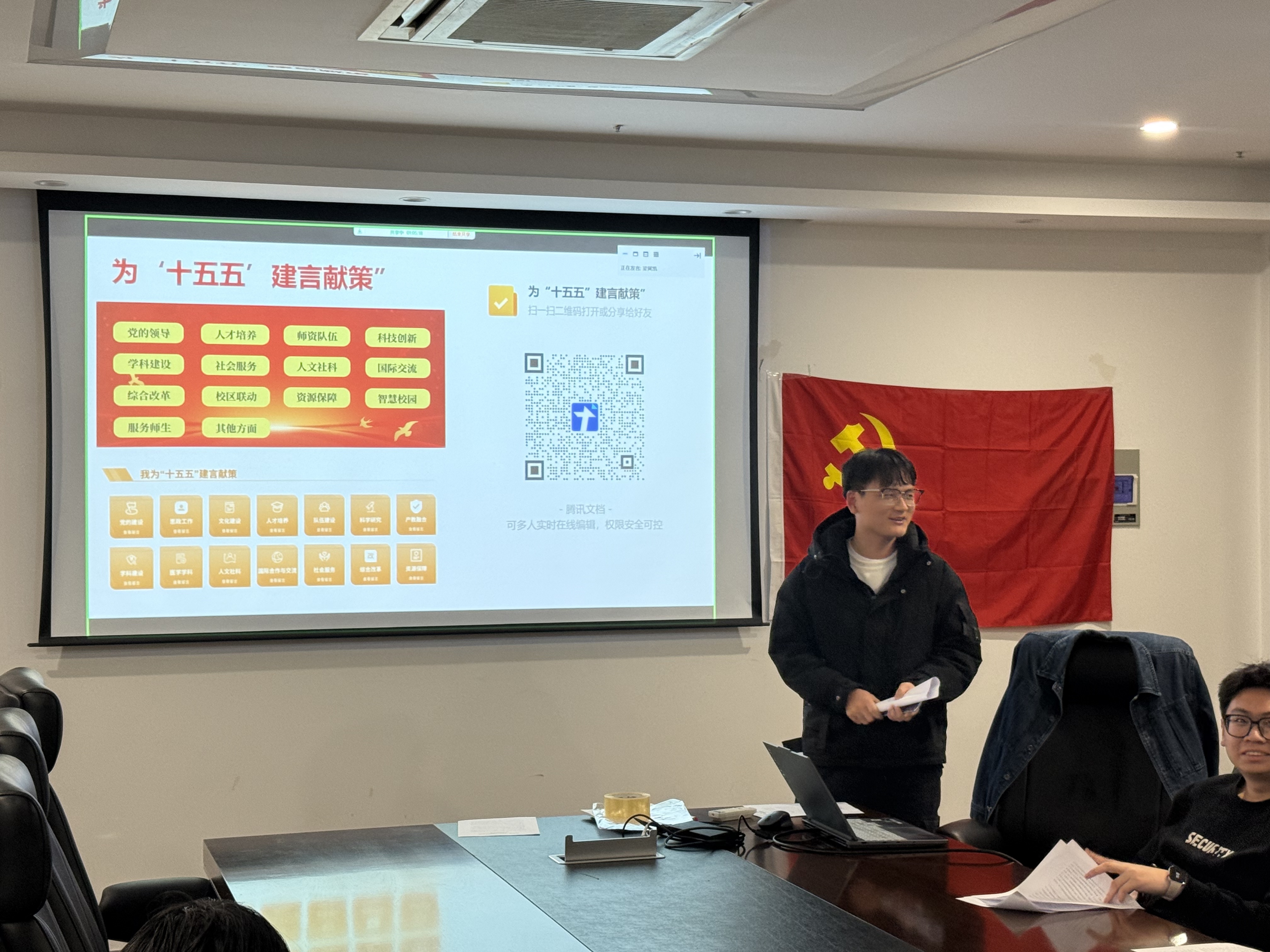 在“我为‘十五五’建言献策”环节,与会党员结合自身学习与科研实际,展开了热烈讨论 。王咏浩同志代表小组发言。他认为,学校的发展与师生切身利益息息相关,建议学校在“十五五”期间重点关注三点:一是加强后勤服务改革,提升校园生活保障水平;二是提供良好的科研平台,助力科研产出;三是重点关注人才培养质量。他表示:“对于‘十五五’规划,我们认为学校应继续坚定不移支持党中央的领导,大力发展优势学科,努力跻身国际一流水平,并进一步深化校企合作。”