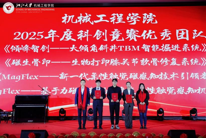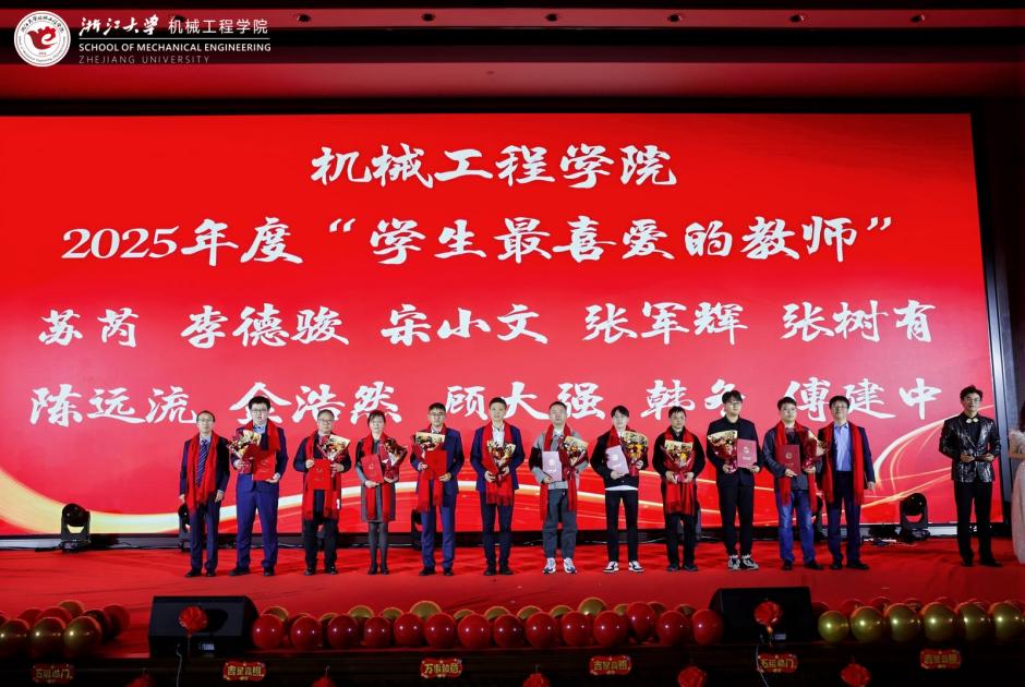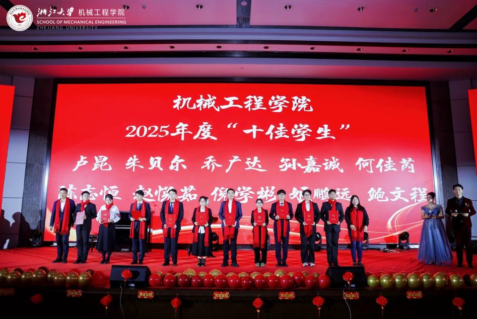 在颁奖环节中,首先颁发了学院2025年度“学生最喜爱的教师”奖,10位老师作为机械学子心目中的人生引路人代表走上舞台,接受属于他们的崇高敬意与热烈掌声。随后进行学院2025年度“十佳学生”颁奖仪式,10位同学凭借拼搏的青春姿态与闪耀的梦想光芒脱颖而出,成为同学们竞相学习的标杆。在最后进行的2025年度“优秀科创团队”颁奖仪式上,3支团队荣耀加冕,集中展现了浙大机械人卓越的创新能力与勇于突破的精神风貌。