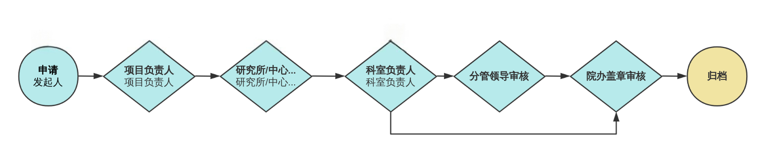 经办人发起申请→项目负责人审核→研究所/中心审核→归口科室审核→分管领导审核(由归口科室根据业务内容,选择是否发起)→打印审批表至学院办公室盖章。具体流程见下图: