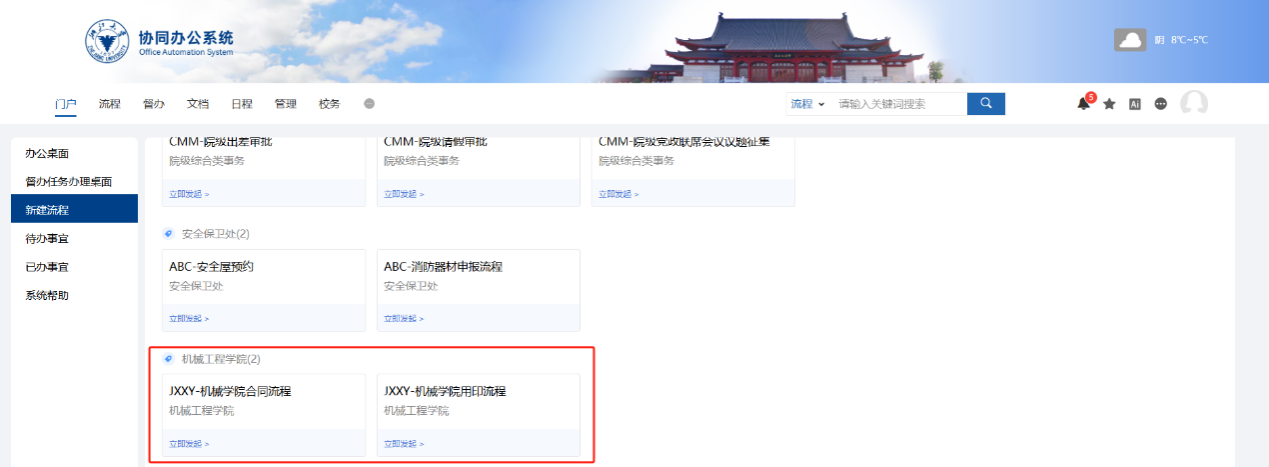 登录学校协同办公系统(OA),在门户页点击“新建流程”,合同/协议审批选择“JXXY-机械学院合同流程”,非合同/协议用印审批选择“JXXY-机械学院用印流程”
