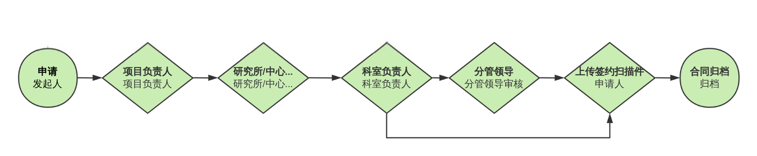 经办人发起申请→项目负责人审核→研究所/中心审核→归口科室审核→分管领导审核(由归口科室根据业务内容,选择是否发起)→打印审批表至学院办公室盖章→双方签字盖章后合同扫描上传系统。具体流程见下图: