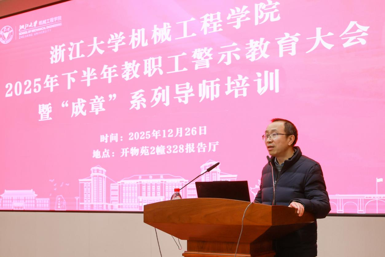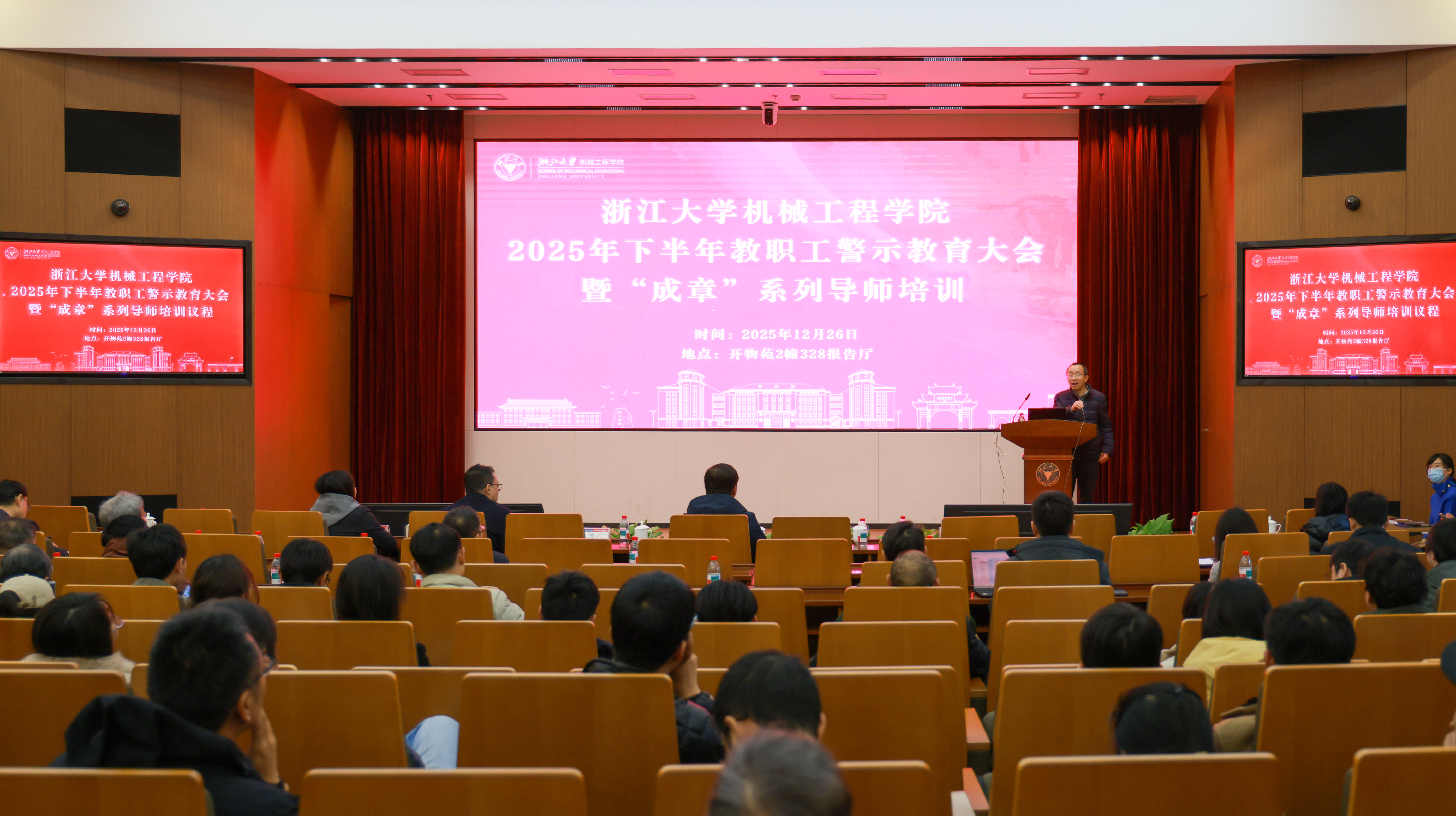 2025年12月26日,机械工程学院2025年下半年警示教育大会暨“成章”系列导师培训会在开物苑报告厅顺利举行,特邀学校计划财务处副处长蒋科、专业学位处副处长陈晓明作专题报告。会议由机械工程学院党委书记兼副院长刘振宇、副院长赵朋共同主持。