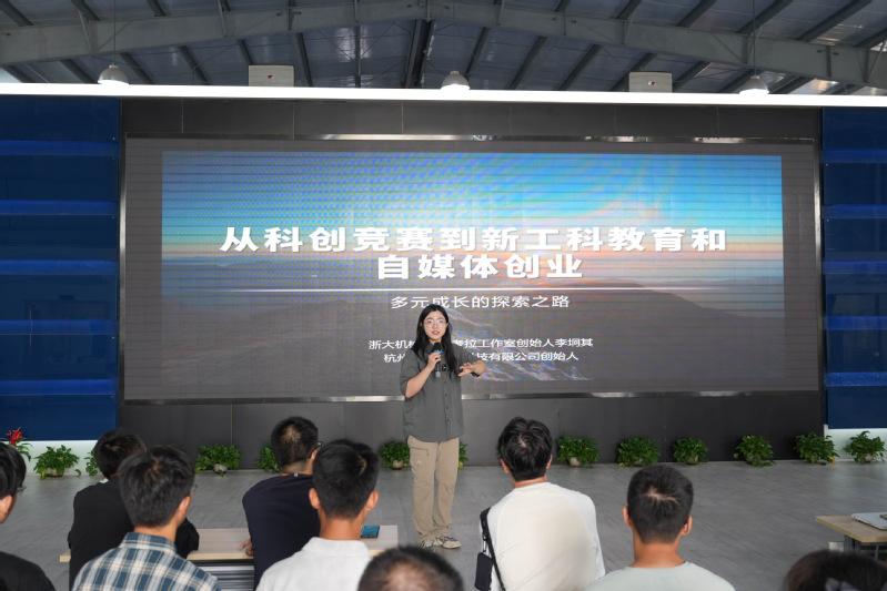 活动伊始,李坰其以时间轴为主线,系统梳理了从本科阶段初显机械天赋、参与各类工程实践,到创立浙江大学学生创新实践平台“考拉工作室”,再到以“赋形科技”为载体投身新工科教育创业的全过程。她结合“求是印”智能篆刻项目、工业排样软件开发及B站“喵星考拉”视频号运营等典型案例,生动阐释了如何将竞赛成果转化为具有社会价值的创业项目,并明确提出“做教育产品,而非工业产品”的核心定位,强调以技术推动教育公平的实践理念。